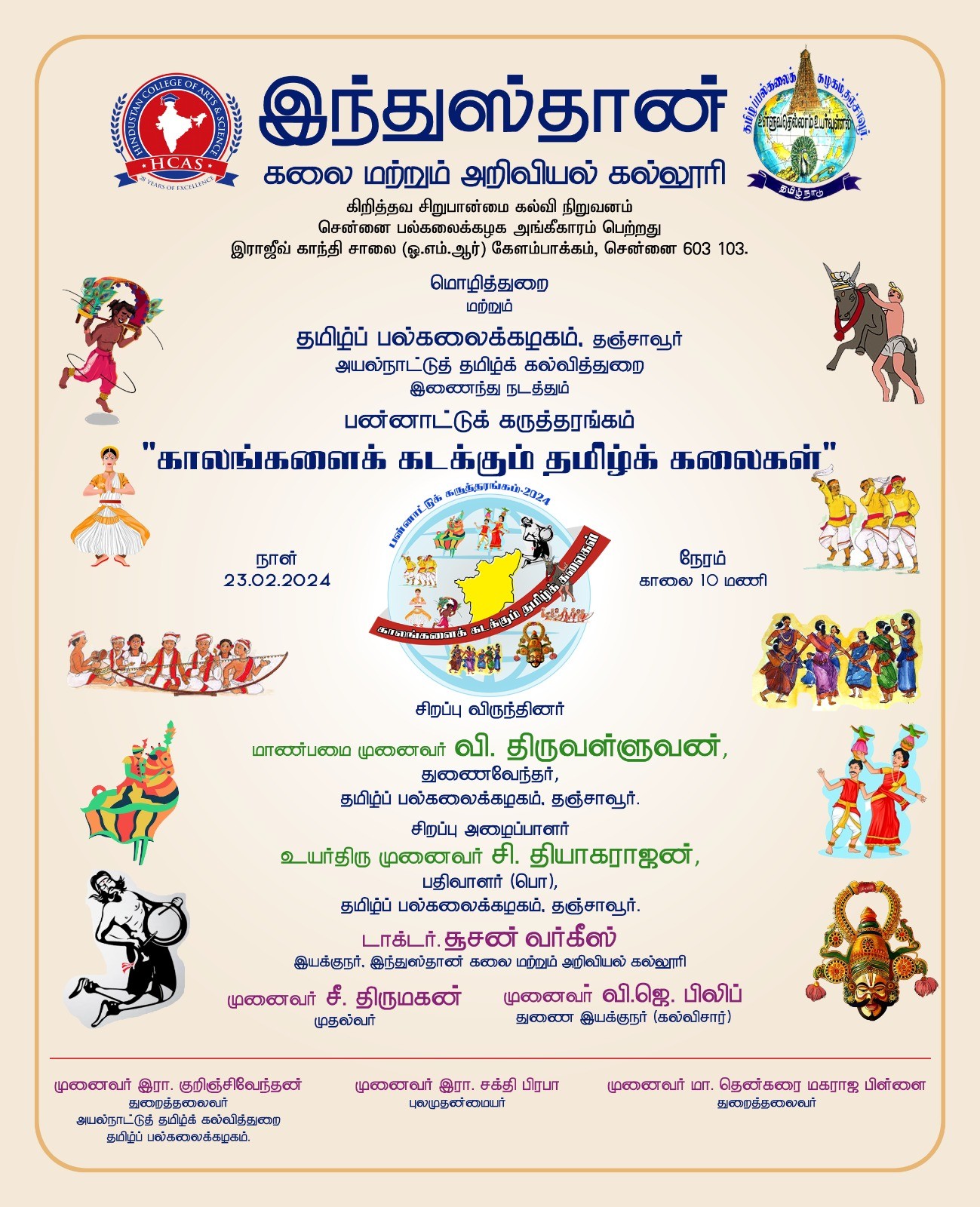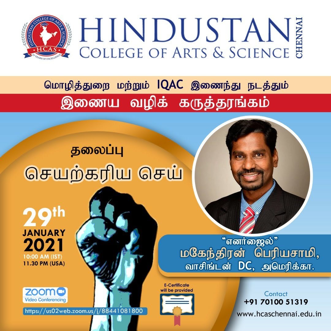 Dr. S. Thirumagan, Principal (Hindustan College of arts and science) and Dr. C. Thiyagarajan, Registar – Tamil University, Thanjavur signed an MOU in the presence of Dr. V. Thiruvallavan, Honorable vice chancellor, Tamil University, Thanjavur on 27th September 2022 for the establishment of Collaborative Research and Co-curricular Activities for Students