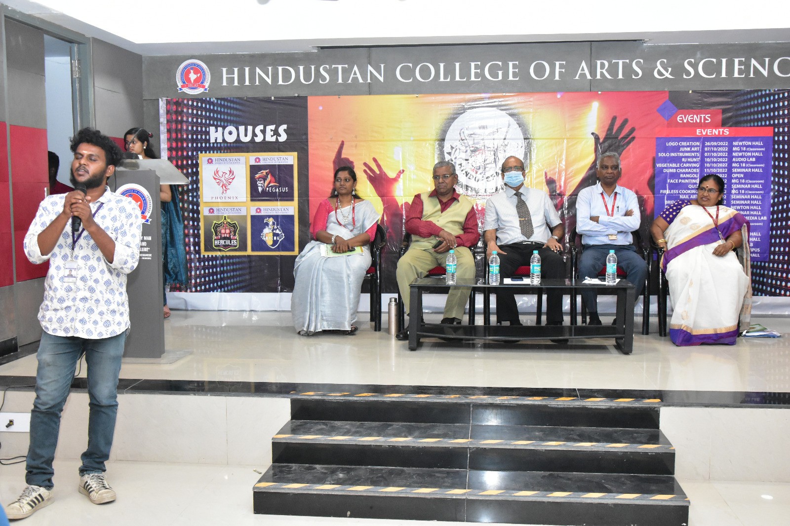 Hindotsav 2024- HCAS Enthiran 3.0, a two-day intercollegiate cultural extravaganza was organized on 29th of February and 1st of March at the HCAS campus in all its zest and vivacity. The meticulously organized event was ebullient. The commencement of the fest was marked by the esteemed presence of Actor Arjun Das and Actor Kalidas Jayaram as guests of honour. Accompanying them, the illustrious crew of the movie “Por” adorned the occasion. Director Susan Verghese, Deputy Director Academics Dr. V. J. Philip, Principal Dr. S. Thirumagan, Vice Principal(Admin) Mr. Samuel Sampathkumar and Vice Principal (Academics & Research) Dr. S. Ilanjiamgraced the occasion. Principal Dr. S. Thirumagan welcomed the gathering. Director Dr. Susan Verghese expressed her overwhelming happiness witnessing the enthusiastic faces of the students and the participants. AnchorAndrews, the host of the day added exuberance to the event. Actor Arjun Das and Actor Kalidas Jayaram shared their nostalgic memories of their college life. They also stressed on the importance of being educated in the competitive world giving equal importance to dreams and passion. Various competitions like adapt tune, solo singing, dual dance, adzap, 60 sec to fame, RJ Hunt, photography, wall painting, rangoli, light music and variety were conducted on Day 1.Dancer Ms. Sinduja, Super Singer fame Ms. Aruna Ravindran,Choreographer Mr.Paal Pachai, Casting directors Mr. Arun & Mr. Aravind,Advertisement director Mr. Deepak Christoper, RJ Bharath, Singer Mr. Devan and Comedian Mr. Robo Shankar judged these events. Around 4500 students from the various city colleges participated in the competitions and enjoyed the vibrant event.